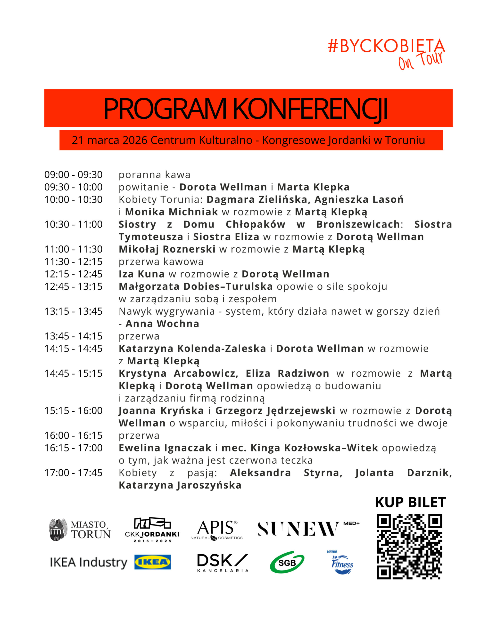 Spędzimy razem cały dzień, a rozpoczniemy go pyszną poranną kawą już o 9.00. Marta Klepka – twórczyni i organizatorka projektu zaprosiła znakomitych gości. W Toruniu spotkamy się z Dorotą Wellman, która jest bardzo ważną częścią naszego projektu. Na scenie wystąpią także m.in.: Iza Kuna, Katarzyna Kolenda-Zaleska, Mikołaj Roznerski, Joanna Kryńska i Grzegorz Jędrzejewski, Katarzyna Jaroszyńska, Siostry z Domu Chłopaków w Broniszewicach. To będzie dzień pełen autentycznych głosów, inspirujących historii i prawdziwej energii.
